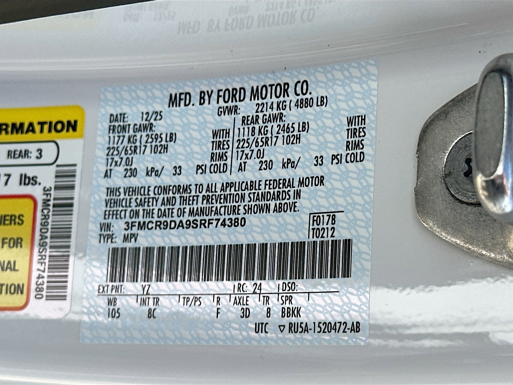 Vinyl/Rubber Floor Trim, Trip Computer, Transmission: 8-Speed SelectShift Automatic -inc: paddle shifters, Transmission w/Driver Selectable Mode and Oil Cooler, Trailer Wiring Harness, Tires: 225/65R17 All Terrain, Tire Specific Low Tire Pressure Warning, Tire Mobility Kit, Tailgate/Rear Door Lock Included w/Power Door Locks, SYNC 4 w/Enhanced Voice Recognition -inc: 13.2 LCD capacitive touchscreen in center stack w/swipe capability, cloud connected, 911 Assist, wireless Apple CarPlay and Android Auto compatibility, digital owners manual and conversational voice command recognition.