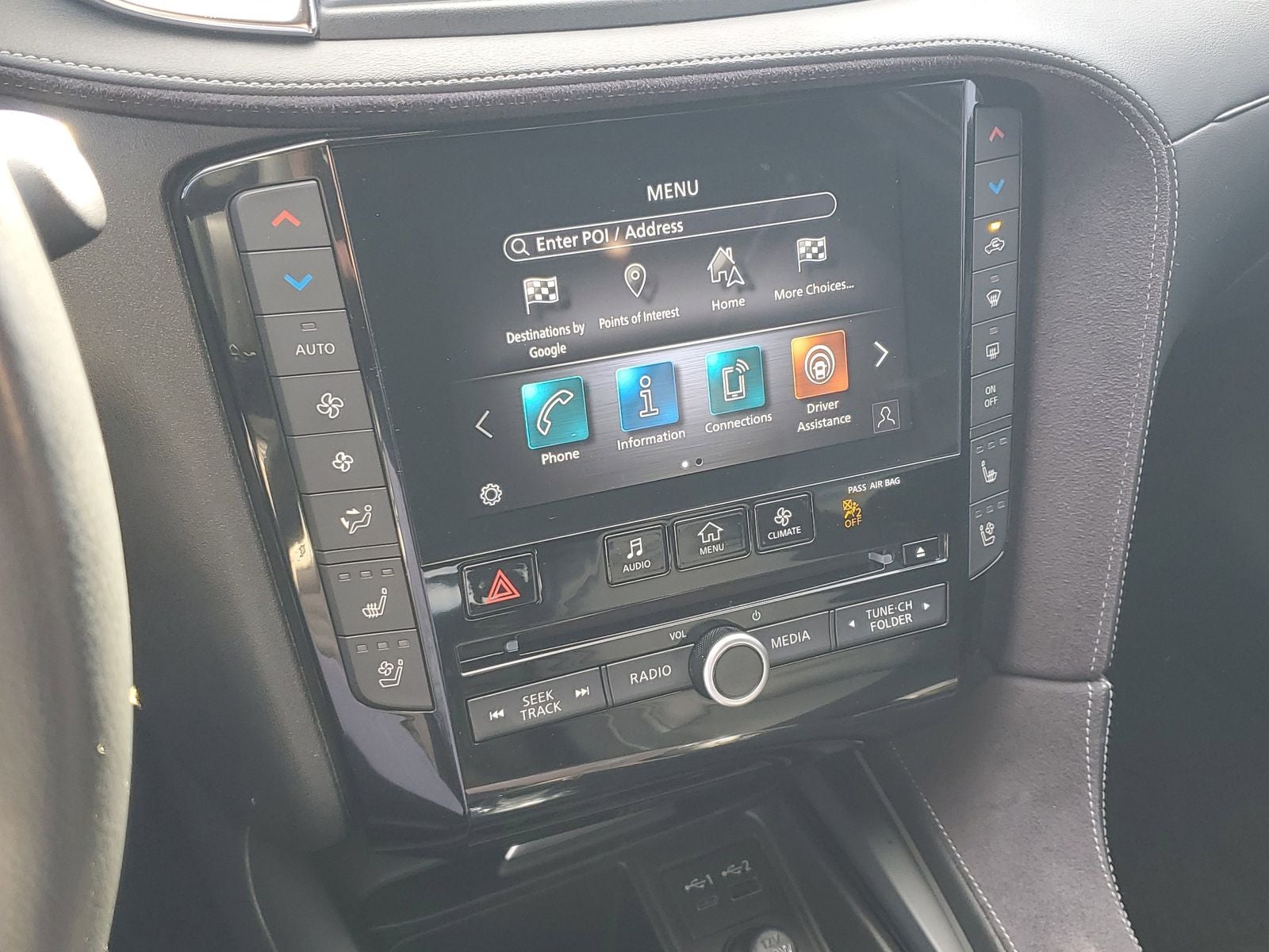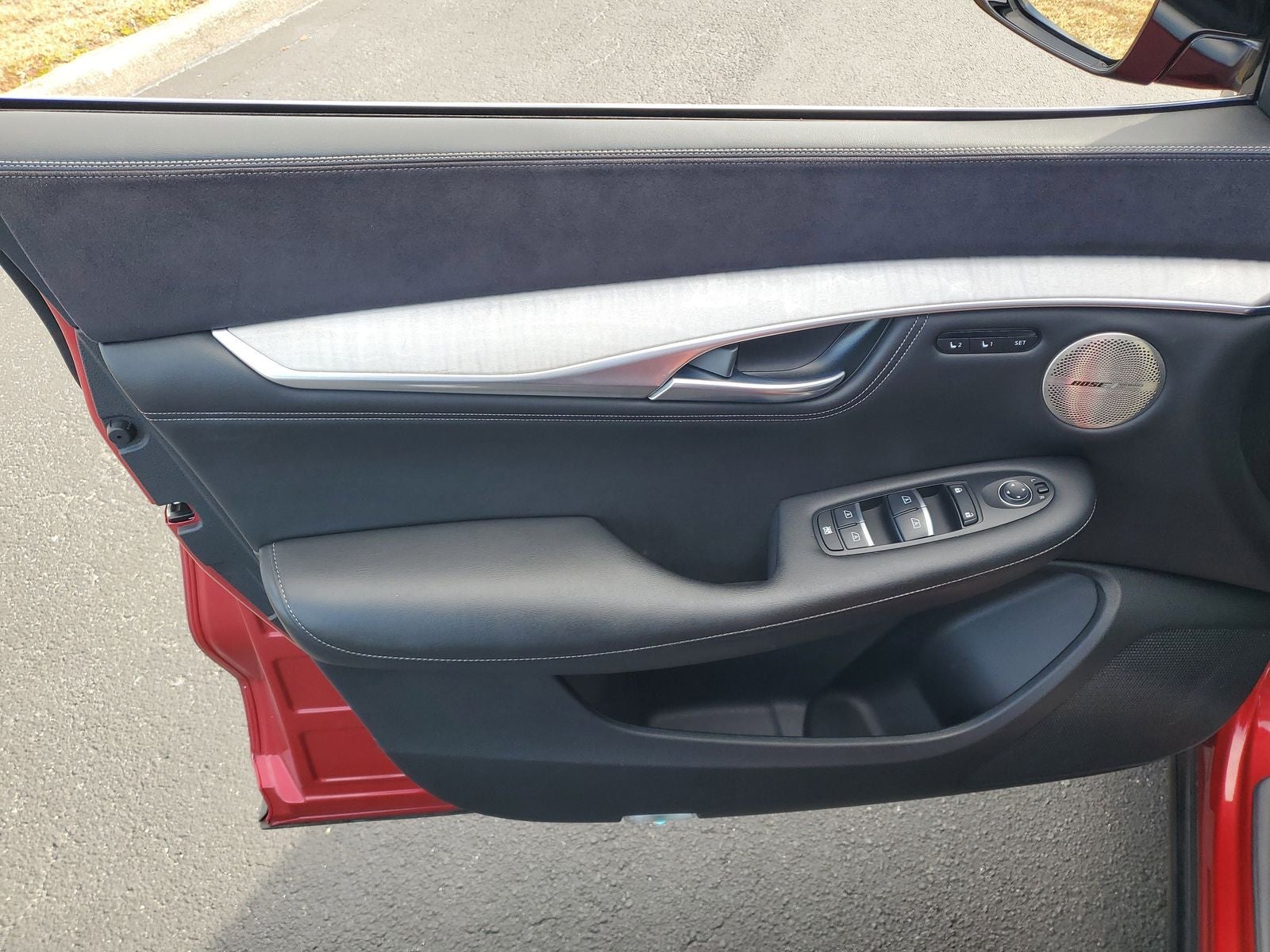 BLUE CERTIFIED, Ford Blue Advantage: Blue Certified Certified, 16 Speakers, 4-Wheel Disc Brakes, 5.846 Axle Ratio, ABS brakes, Air Conditioning, Alloy wheels, AM/FM radio: SiriusXM, Anti-whiplash front head restraints, Apple CarPlay/Android Auto, Auto High-beam Headlights, Auto tilt-away steering wheel, Auto-dimming Rear-View mirror, Automatic temperature control, Brake assist, Bumpers: body-color, CD player, Climate Controlled Front Bucket Seats, Delay-off headlights, Driver door bin, Driver vanity mirror, Dual front impact airbags, Dual front side impact airbags, Electronic Stability Control, Emergency communication system: INFINITI InTouch, Exclusive Paint - Dynamic Sunstone Red, Floor Mats, Four wheel independent suspension, Front anti-roll bar, Front Bucket Seats, Front Center Armrest, Front dual zone A/C, Front fog lights, Front reading lights, Garage door transmitter: HomeLink, Heads-Up Display, Heated door mirrors, Heated front seats, Heated steering wheel, Illuminated entry, Illuminated Kick Plates, Knee airbag, Leather Shift Knob, Literature Kit, Low tire pressure warning, Memory seat, Navigation system: INFINITI InTouch Navigation, Occupant sensing airbag, Outside temperature display, Overhead airbag, Overhead console, Panic alarm, Passenger door bin, Passenger vanity mirror, Power door mirrors, Power driver seat, Power Liftgate, Power moonroof, Power passenger seat, Power steering, Power windows, Radio data system, Radio: Bose Performance Series Audio System, Rain sensing wipers, Rear air conditioning, Rear anti-roll bar, Rear reading lights, Rear seat center armrest, Rear side impact airbag, Rear window defroster, Rear window wiper, Remote keyless entry, Security system, Semi-Aniline Leather Seat Trim, Speed control, Speed-sensing steering, Speed-Sensitive Wipers, Splash Guards (Set of 4), Split folding rear seat, Spoiler, Steering wheel memory, Steering wheel mounted audio controls, Tachometer, Telescoping steering wheel, Tilt steering wheel, Traction control, Trip computer, Turn signal indicator mirrors, Variably intermittent wipers, Ventilated front seats, Welcome Lighting, Wheels: 20 x 8.5J Dark Painted.